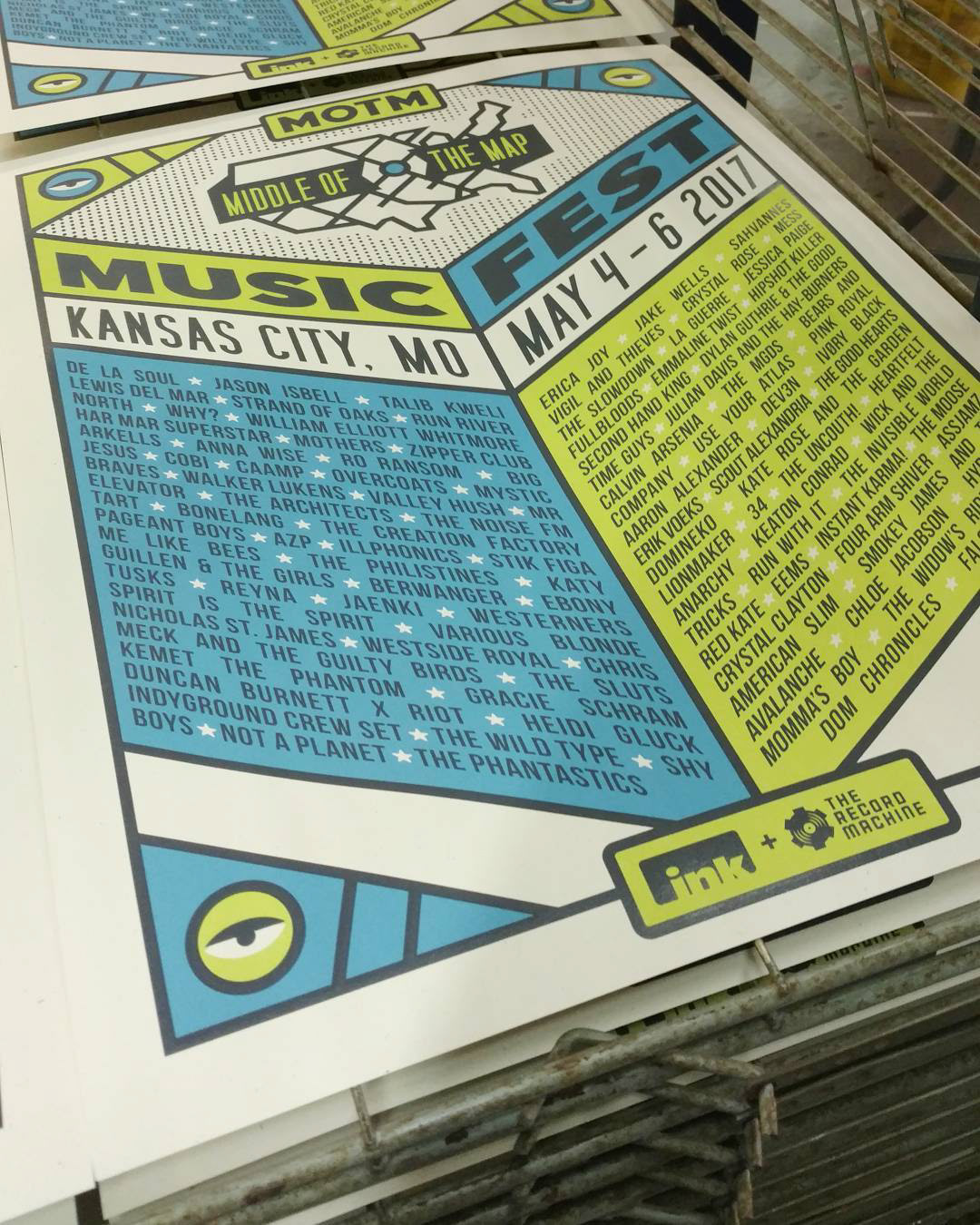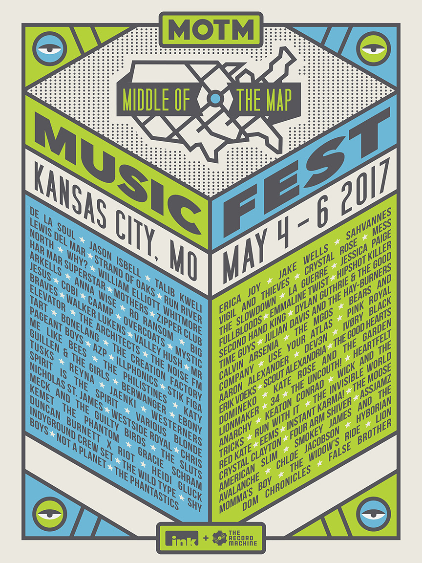 3-color screen printed poster for Middle of the Map Festival, 2017. 18 x 24" - 100 lb Cover French Madero Beach Printed at Ink Tank Merch, Omaha, NE