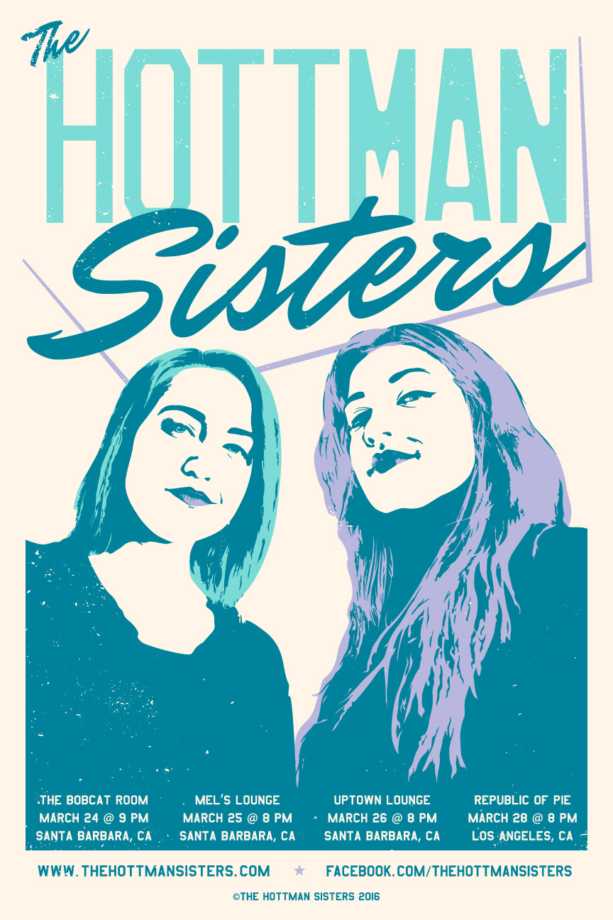 3-color screen printed poster for The Hottman Sisters, 2016. 12 x 18" - 100 lb Cover Printed at Ink Tank Merch, Omaha, NE
